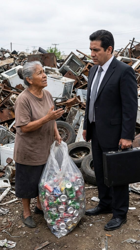 A lo lejos, el portón chirrió. Una figura pequeña, encorvada por los años y el peso de una bolsa de plástico, avanzaba con dificultad sobre el terreno irregular. Era Doña Amalia. Sus zapatos viejos se hundían en el barro mientras sus manos, nudosas por la artritis, apretaban con fuerza su único tesoro: unas latas de aluminio que había recogido durante tres días bajo el sol.