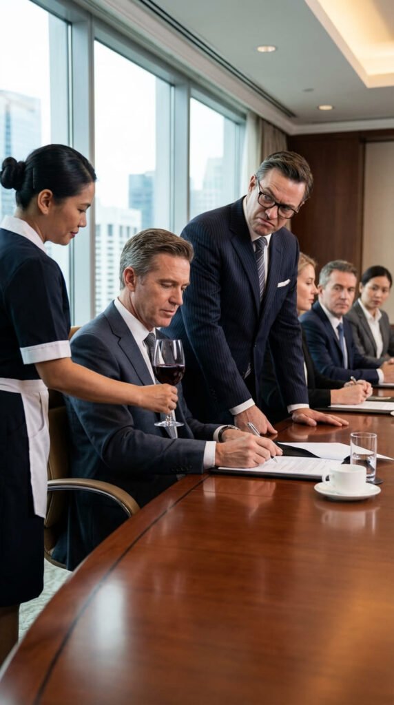 En una esquina de la sala, Elena, una mujer de mediana edad con el uniforme de limpieza impecablemente planchado, rellenaba discretamente las tazas de café. Elena era invisible para los hombres de negocios, una sombra que pasaba desapercibida mientras ellos decidían el destino de imperios.