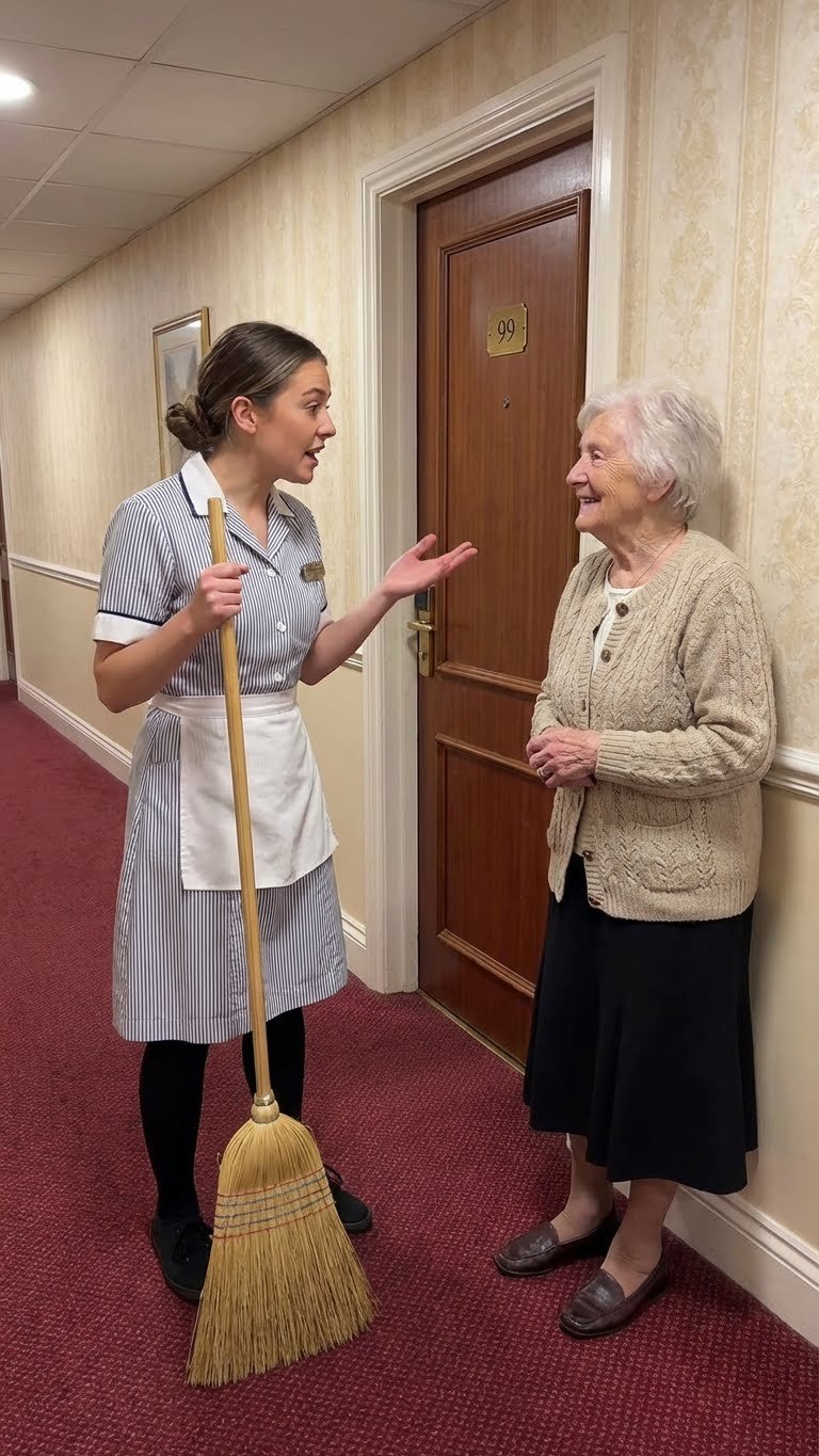 Al final del pasillo, justo frente a la puerta de madera maciza con el número "99" en una placa dorada, había una mujer mayor. No parecía una huésped cualquiera. A pesar de su edad avanzada, emanaba una elegancia aristocrática que imponía respeto inmediato. Vestía una chaqueta de punto color beige de cachemira, una falda negra impecable y, lo que más llamó la atención de Elena, un collar de perlas que parecía valer más que todo el edificio donde Elena vivía.