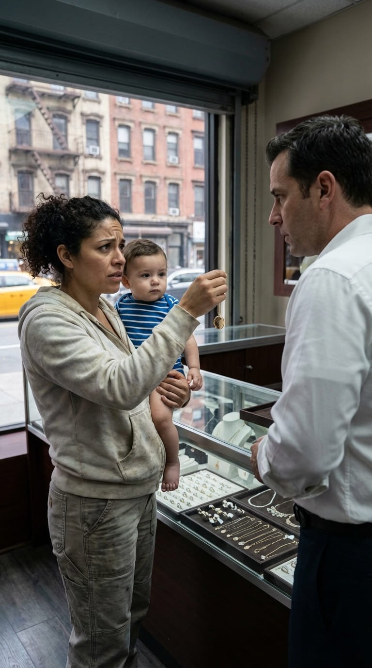 —"Buenas tardes, señor" —dijo con una voz que era apenas un susurro quebrado—. "¿Cuánto me da por este collar? Es lo único que tengo para alimentar a mi bebé hoy."