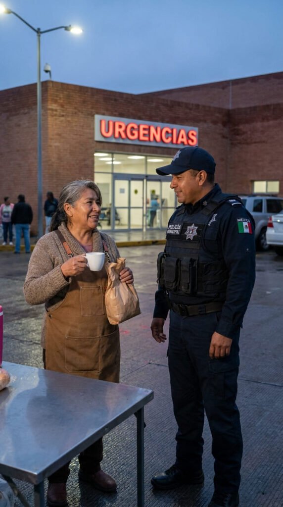 Mateo no era un oficial cualquiera; llevaba años patrullando esa zona, ganándose el respeto de los médicos y el cariño de los desamparados. Pero su momento favorito de la jornada siempre era el mismo: el encuentro con Doña Rosa, la mujer que, con un carrito destartalado y una sonrisa inquebrantable, repartía calor en forma de café a quienes esperaban noticias de sus seres queridos.