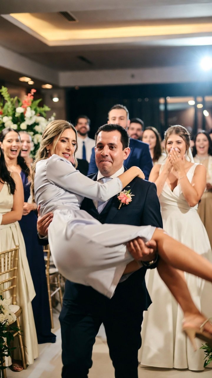 Se suponía que este era el momento culminante. La tradición en la familia de Carlos, mi ahora esposo (o eso creía yo), era estricta y clara: el novio debía cargar a la novia para cruzar el umbral del salón, simbolizando protección, cuidado y el inicio de una nueva vida juntos bajo el mismo techo.